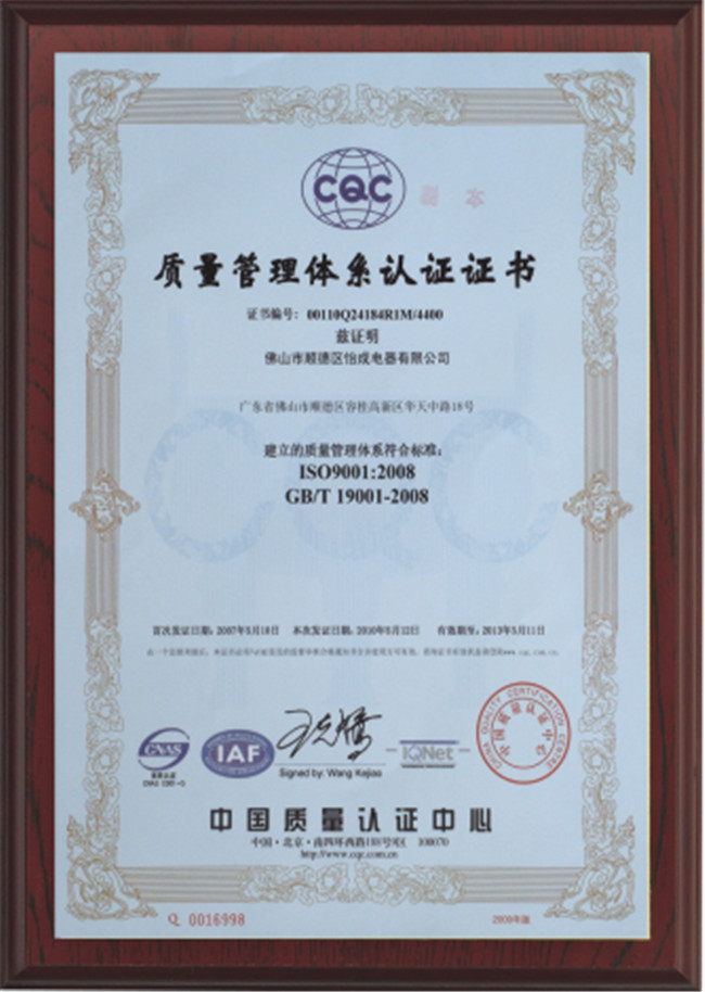 企業通過IS09001:2000國際體系認證,并全面嚴格按照IS09001:2000體系進行運營管理。企業是中國土木工程學會燃氣分會會員單位、廣東家電商會會員單位、順德燃氣具商會會員單位、順德家電商會會員單位,公司是國家出口產品二類企業,公司主要產品出口北美和歐洲地區,公司一貫堅持質量、信譽至上...